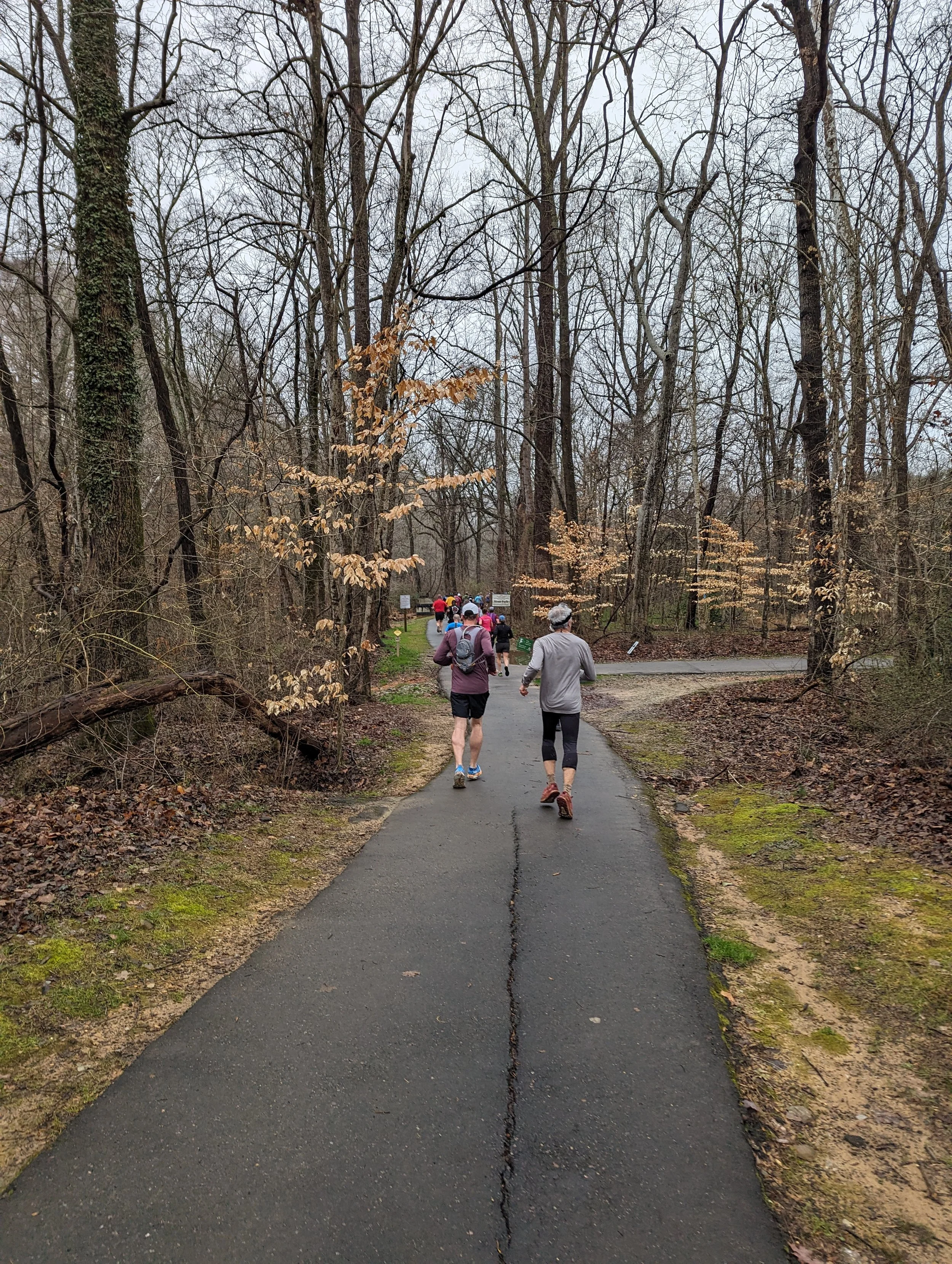 The race started promptly at 9am on the historic speedway in front of the concrete risers, and we were off! After running the straightaway of the former NASCAR dirt oval, we headed right onto the Mountains-to-Sea Trail. Soon the MST runs in tandem with the Hillsborough Riverwalk, which is primarily packed dirt or pea gravel at this point, and includes some informational signs and the Occaneechi Village Replica Site (as you might intuit, this is all on the historic lands of the Occaneechi people). The riverwalk has some wooden boardwalks and eventually turns into a paved greenway with various bridges criss-crossing the Eno River until it reaches Gold Park at around the 2.5 mile mark. At Gold Park there’s an aid station and there’s usually some opportunity to get in some good doggo pets at the dog park right next to the greenway, or sometimes you can find small children bundled up with families to cheer on their runner in between playing on the playground.